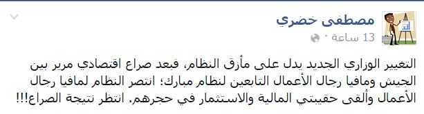 وأضاف “الخضري” -عبر منشور له على “فيس بوك”- “فبعد صراع اقتصادي مرير بين الجيش ومافيا رجال الأعمال التابعين لنظام مبارك، انتصر النظام لمافيا رجال الأعمال وألقى حقيبتي المالية والاستثمار في حجرهم”.
