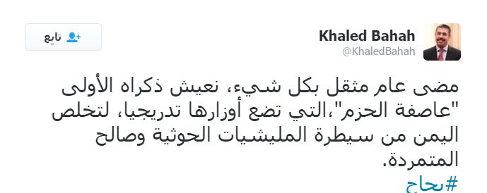 وقال وزير الخارجية البحريني خالد بن أحمد، عبر تغريدة له على “تويتر”: “عام من الحزم والعزم، وبذل الغالي والنفيس بدمائنا وأرواحنا، وأعز أبنائنا، في سبيل أوطاننا وإخواننا”، مضيفا: “اللهم احفظ قادتنا وشعوبنا”.