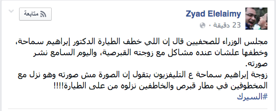 وقال عضو مجلس الشعب السابق، زياد العليمي، إن مجلس الوزراء قال للصحفيين: “إن اللي خطف الطيارة الدكتور إبراهيم سماحة، وخطفها علشان عنده مشاكل مع زوجته القبرصية، واليوم السابع نشر صورته”.