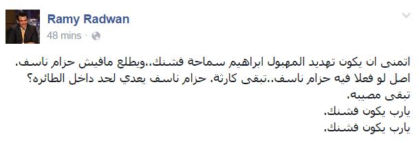 – الإعلامي رامي رضوان: “أتمنى يكون تهديد المهبول إبراهيم سماحة فشنك.. ويطلع مافيش حزام ناسف”.