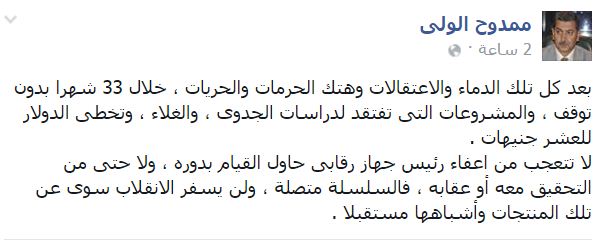 وأضاف “الولي” – عبر منشور له على “فيس بوك”-: “بعد كل تلك الدماء والاعتقالات وهتك الحرمات والحريات، خلال 33 شهرا بدون توقف، والمشروعات التي تفتقد لدراسات الجدوى، والغلاء، وتخطى الدولار للعشر جنيهات، لا تتعجب من إعفاء رئيس جهاز رقابي حاول القيام بدوره، ولا حتى من التحقيق معه أو عقابه، فالسلسلة متصلة، ولن يسفر الانقلاب سوى عن تلك المنتجات وأشباهها مستقبلا”.