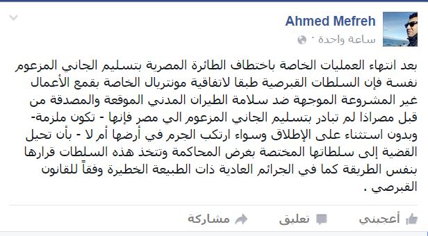 وقال -عبر منشور له على “فيس بوك”-: “بعد انتهاء العمليات الخاصة باختطاف الطائرة المصرية بتسليم الجاني المزعوم نفسه، فإن السلطات القبرصية وفقًا لاتفاقية مونتريال الخاصة بقمع الأعمال غير المشروعة الموجهة ضد سلامة الطيران المدني الموقعة والمصدقة من قبل مصر إذا لم تبادر بتسليم الجاني المزعوم إلى مصر فإنها -تكون ملزمة- ودون استثناء على الإطلاق وسواءً ارتكب الجرم في أرضها أم لا بأن تحيل القضية إلى سلطاتها المختصة بغرض المحاكمة”.