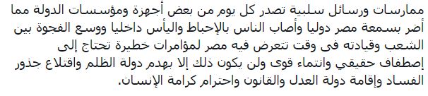 وأكد أن هناك “ممارسات ورسائل سلبية تصدر كل يوم من بعض أجهزة ومؤسسات الدولة تضر بسمعة مصر دوليًا وتصيب الناس باﻹحباط واليأس داخليًا ووسع الفجوة بين الشعب وقيادته في وقت تتعرض فيه مصر لمؤامرات خطيرة تحتاج إلى اصطفاف حقيقي”.