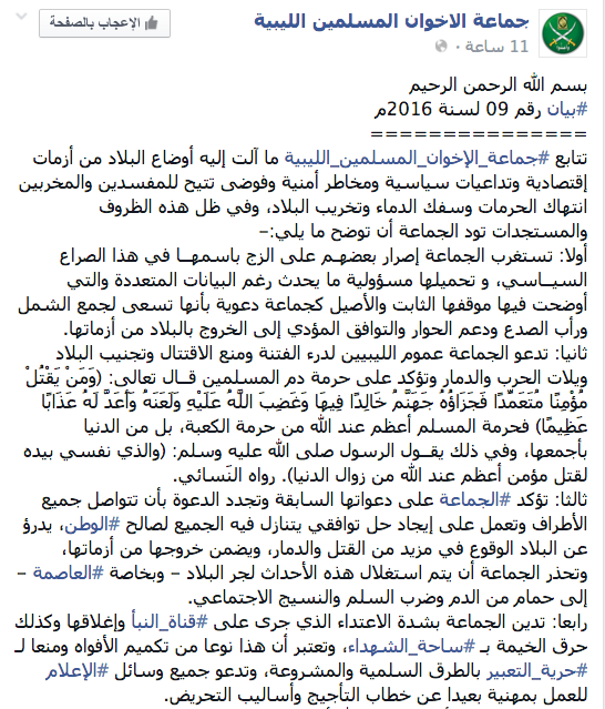 ودعت الجماعة عموم الليبيين لدرء الفتنة ومنع الاقتتال وتجنيب البلاد ويلات الحرب والدمار وتؤكد على حرمة دم المسلمين.
