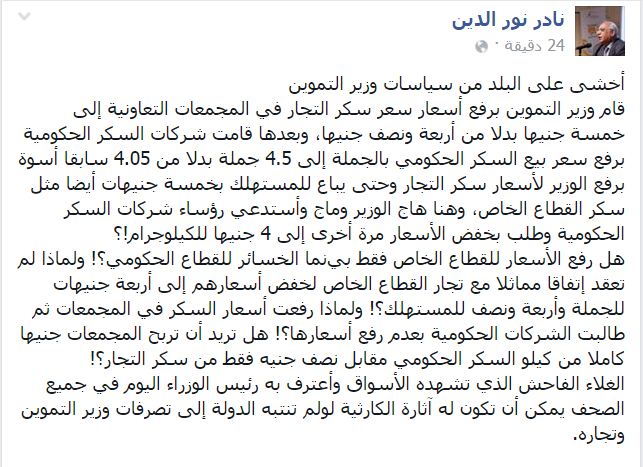 وقال -عبر منشور له على “فيس بوك”- تحت عنوان “أخشى على البلد من سياسات وزير التموين”: إن وزير التموين رفع أسعار سعر سكر التجار في المجمعات التعاونية إلى خمسة جنيهات بدلًا من أربعة ونصف جنيه، وبعدها قامت شركات السكر الحكومية برفع سعر بيع السكر الحكومي بالجملة إلى 4.5 جملة بدلًا من 4.05 سابقًا أسوة برفع الوزير لأسعار سكر التجار وحتى يباع للمستهلك بخمسة جنيهات أيضًا مثل سكر القطاع الخاص.