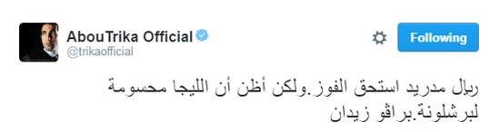 وكتب أبوتريكة في تغريدة له على موقع التواصل الاجتماعي “تويتر”: “ريال مدريد استحق الفوز، لكن أظن أن الليجا محسومة لبرشلونة، براڤو زيدان”.