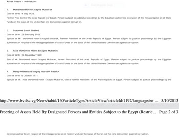 وتشرح الوثيقة أسباب تجميد أصول وحسابات الشخصيات المذكورة؛ نظرًا لاتهامهم في قضايا فساد واختلاس من الميزانية العامة للدولة المصرية، ما عرقل مسيرة الديمقراطية وجرد الشعب المصري من فوائد التنمية.