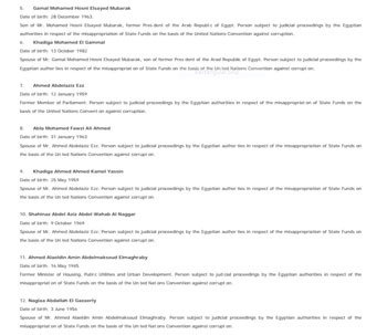 شملت القائمة وزير الداخلية الأسبق حبيب العادلي، وزوجته إلهام سيد سالم شرشر، ووزير الإسكان في عهد الرئيس مبارك أحمد المغربي، وزوجته نجلاء الجزايرلي، ووزير التجارة والصناعة رشيد محمد رشيد وزوجته هانيا محمود عبدالرحمن، ووزير السياحة محمد زهير جرانة وزوجته جايلان شوكت حسني، ونجله أمير محمد زهير جرانة.