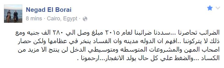 استنكر المحامي الحقوقي نجاد البرعي زيادة تحصيل الضرائب من المشروعات الصغيرة والمتوسطة، مشيرا إلى أن ذلك سيسبب المزيد من الكساد؛ حيث قال -عبر منشور له على “فيس بوك”-: “الضرائب تحاصرنا.. سددنا ضرائبنا لعام ٢٠١٥ مبلغ وصل إلى ٢٨٠ ألف جنيه ومع ذلك لا يتركوننا”.