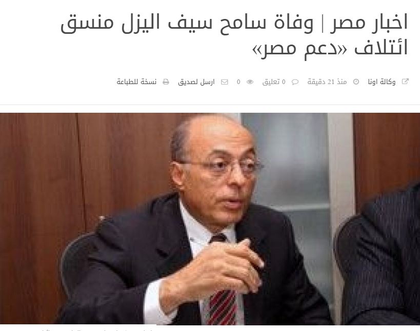أعلن النائب أسامة هيكل نائب رئيس ائتلاف دعم مصر، أن اللواء سامح سيف اليزل رئيس الائتلاف توفي منذ قليل، بعد معاناة كبيرة مع المرض، أدت إلى دخوله أحد المستشفيات المتخصصة وبقائه الساعات الأخيرة بغرفة الرعاية المركزة وعلى أجهزة التنفس الصناعي.