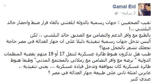 استنكر الناشط الحقوقي، جمال عيد، مدير الشبكة العربية لحقوق الإنسان، تدخل جهات رسمية في قضية عضو مجلس نقابة الصحفيين خالد البلشي.