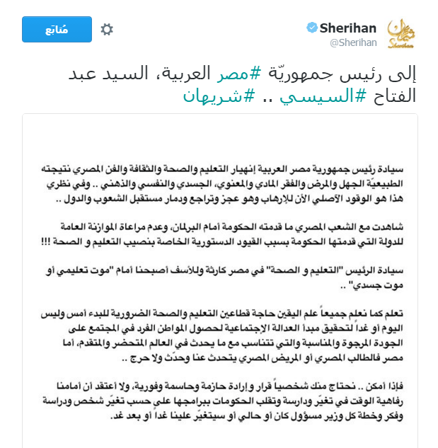 عبرت الفنانة شريهان عن استيائها من تدهور الأوضاع الحالية في مصر، من خلال رسالة وجهتها للسيسي عبر تغريدة نشرتها على حسابها الشخصي علي تويتر، تتضمن صورة الرسالة التي قالت فيها: “سيادة رئيس جمهورية مصر العربية، انهيار التعليم، والصحة، والفن المصري، والثقافة، نتيجته الطبيعية الجهل والمرض والفقر المادي والمعنوي والجسدي والذهني والنفسي، وفي نظري هذا هو الوقود الأصلي، الآن للإرهاب وهو عجز وتراجع ودمار مستقبل شعوب الدول”.