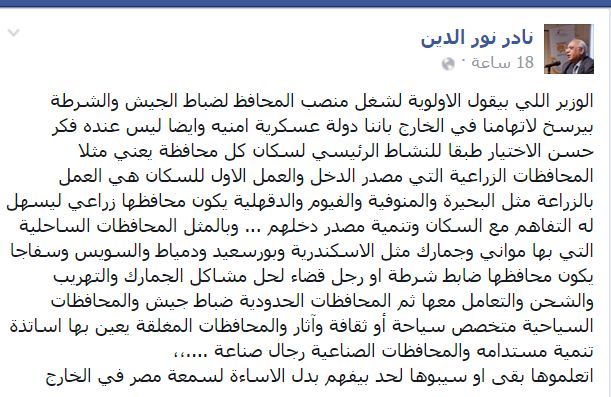 ويعلق “نور الدين” -عبر منشور له على “فيس بوك”-: “الوزير اللي بيقول الأولوية لشغل منصب المحافظ لضباط الجيش والشرطة بيرسخ لاتهامنا في الخارج بأننا دولة عسكرية أمنية.