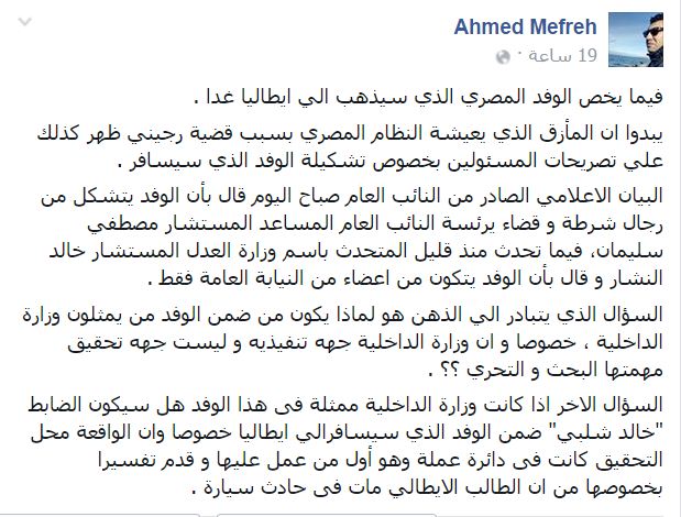 وقال “مفرح” -عبر منشور له على “فيس بوك”-: “يبدو أن المأزق الذي يعيشه النظام المصري بسبب قضية ريجيني ظهر كذلك على تصريحات المسؤولين بخصوص تشكيلة الوفد الذي سيسافر.”