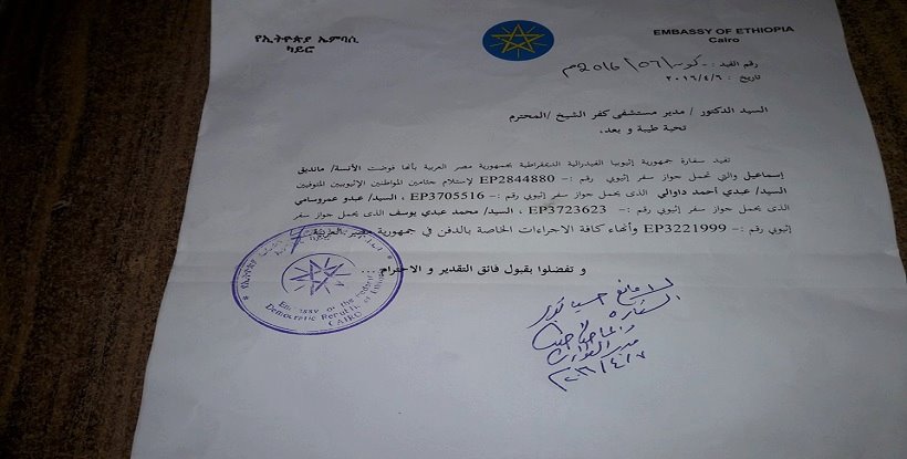وقال الدكتور زيدان المنشاوي، مدير مستشفى كفر الشيخ العام، إنَّ وفدًا حضر إلى المستشفى، اليوم الخميس، بخطاب رسمي من السفارة الإثيوبية، برئاسة مانديق إسماعيل؛ لإنهاء إجراءات دفن الجثث بكفر الشيخ.