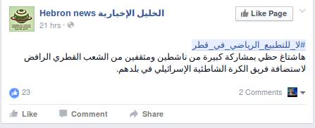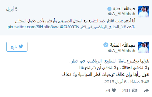 ومن بين المشاركين في الحملة، رئيس تحرير صحيفة “العرب” القطرية عبد الله العذبة، الذي أعلن عن رفضه لموقف الاتحاد الرياضي باستقبال الفريق الإسرائيلي.