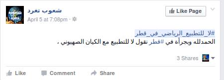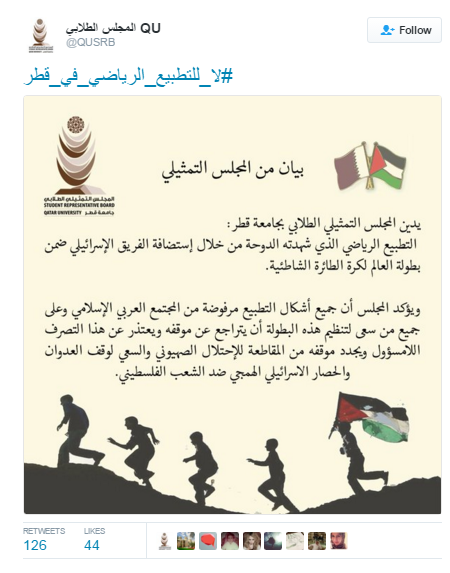 وأطلق المغردون القطريون حملة “#لا_للتطبيع_الرياضي_في_قطر” على موقع التواصل الاجتماعي “تويتر”، وشارك بها عدد من الإعلاميين والباحثين القطريين.