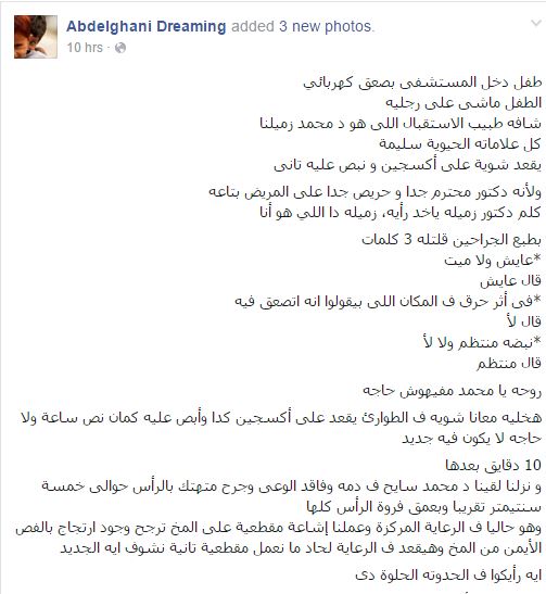وأضاف: د. محمد رفض أن يخرج الطفل دون الاطمئنان بشكل نهائي على صحته، إلا أن الأطباء فوجئوا بأهل الطفل وقد ضربوا د. محمد وسحلوه أرضًا.