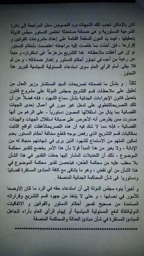 ثالثًا: وبشأن ما تضمنته تصريحات السيد المستشار وزير العدل من تعليق على ملاحظات قسم التشريع بمجلس الدولة على مشروع قانون بتعديل قانون الإجراءات الجنائية بشأن سماع الشهود، فإنه فضلًا عن أن تلك التصريحات تنطوي على تدخل غير مبرر في أعمال إحدى الجهات القضائية بما ينال من استقلالها المصون دستوريًا -على الرغم من أنها صدرت ممن يفترض أنه الأحرص على صيانة استقلال الجهات والهيئات القضائية- فإنه مما لا شك فيه أن هذه التصريحات أغفلت الواقع الثابت بمكاتبات قسم التشريع الذي رفض بوجه قاطع مخالفة أحكام الدستور بعدم تمكين المتهم من الاستماع للشهود الذين يرى في شهادتهم منجاة له من الإدانة، ولا يغير من هذا المبدأ قولا بأن هذا الأمر يخضع لتقدير محكمة الموضوع، ذلك أن التعديلات المشار إليها جعلت التقدير في هذا الشأن بلا معقب عليه من محكمة الطعن، في تحصن تقدير محكمة الموضوع في هذا الشأن من أي نقض، وهو ما يتنافى مع كل المبادئ المستقرة قضائيا ودستوريا في شأن المحاكمة الجنائية المنصفة.