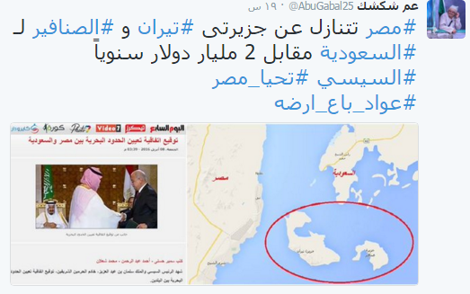 واستقبل رواد الشبكات الاجتماعية الخبر مستائين من تنازل مصر عن جزيرتي تيران وصنافير الواقعتين في مدخل خليج العقبة على البحر الأحمر، للسعودية مقابل إبرام صفقات تجارية أخرى.