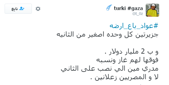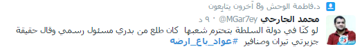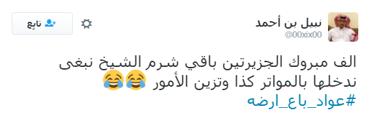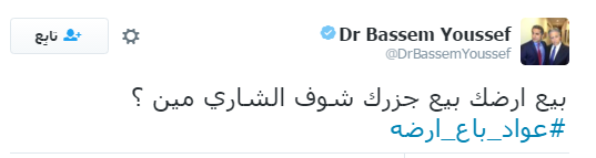 وكتب “يوسف” عبر حسابه على على موقع “تويتر” قائلًا: “بيع أرضك، بيع جزرك، شوف الشاري مين؟”، وكتب يوسف ذلك تحت هاشتاج “#عواد_باع_أرضه”.