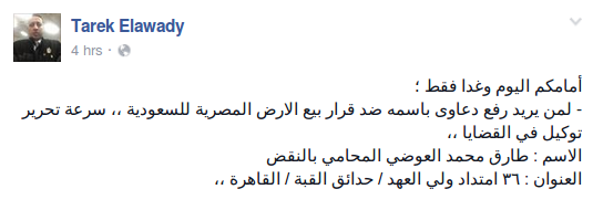 وقال -عبر منشور له على “فيس بوك”-: “أمامكم اليوم وغدًا فقط، لمن يريد رفع دعاوى باسمه ضد قرار بيع الأرض المصرية للسعودية، مطالبًا بسرعة تحرير توكيل في القضايا، باسم طارق محمد العوضي المحامي بالنقض، العنوان: ٣٦ امتداد ولي العهد – حدائق القبة- القاهرة”.