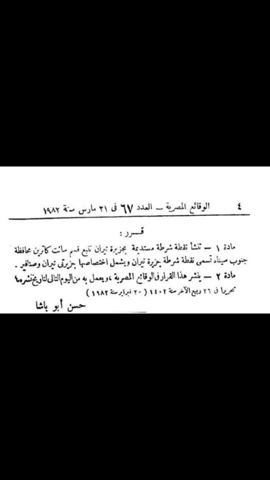 ونشرت جريدة الوقائع المصرية في ٢١ مارس عام ١٩٨٢، في عهد الرئيس المخلوع حسني مبارك، وتضمن مادتين؛ أولاهما: تنشأ نقطة شرطة مستديمة بجزيرة تيران تتبع قسم سانت كاترين لمحافظة جنوب سيناء تسمى نقطة شرطة جزيرة تيران ويشمل اختصاصها جزيرتي تيران وصنافير.
