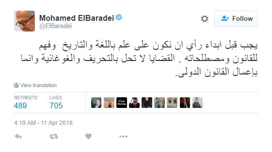وتأتي تغريدة البرادعي في ظل جدل مستمر على وسائل التواصل الاجتماعي بشأن ملكية جزيرتي تيران وصنافير، اللتين أعلنت الحكومة المصرية تبعيتهما للمملكة العربية السعودية.