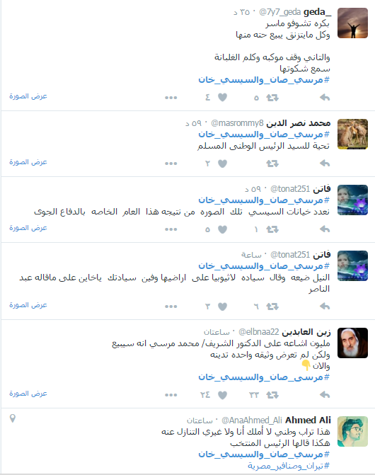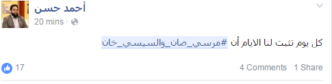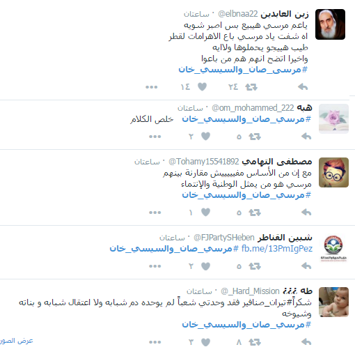 ومن أبرز التعليقات التي جاءت في هذا الصدد تحت هاشتاج “مرسي صان والسيسي خان” الذي حقق ترند بعد لحجم التفاعل على شبكات التواصل خلال الساعات الأخيرة: