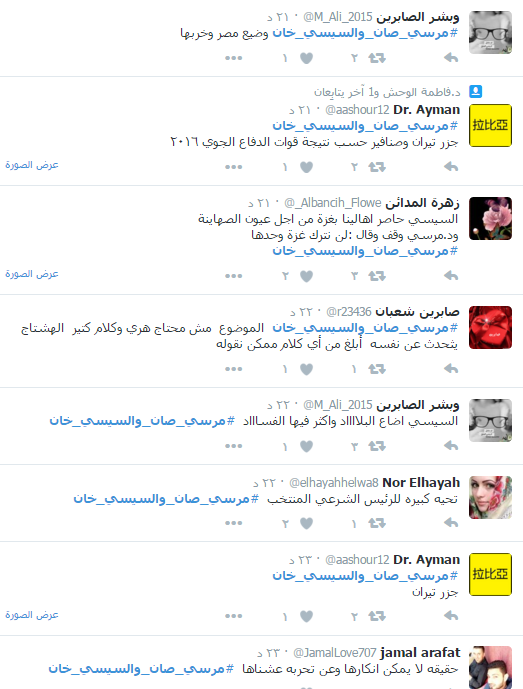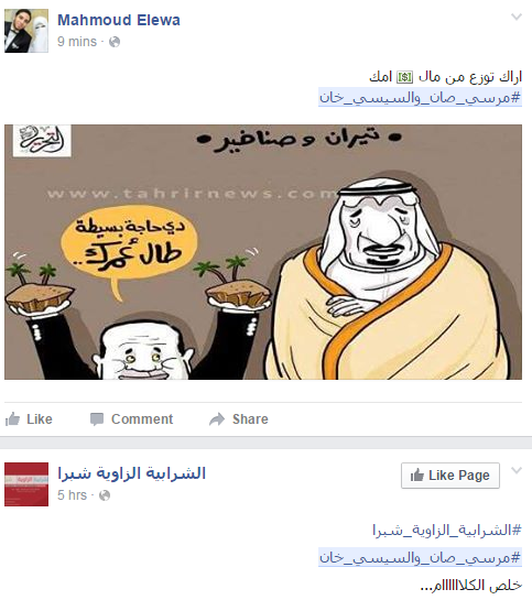 دشن رواد مواقع التواصل الاجتماعي "فيس بوك" و"تويتر" هاشتاجا تحت عنوان "مرسي صان والسيسي خان"؛ إثر تنازل مصر عن جزيرتي ''تيران وصنافير'' للسعودية