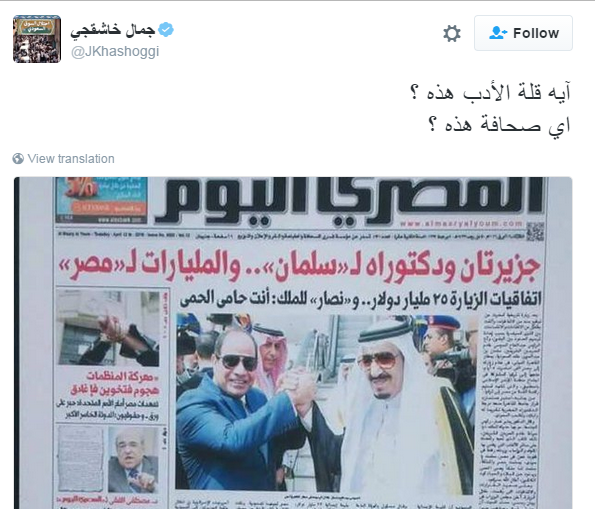 من جانبه علق جمال جاشقجي، الإعلامي السعودي ومدير قناة العرب على المانشيت الأصلي، ووصفه بأنه خارج عن الأدب قائلا عبر حسابه بموقع التدوين المصغر “تويتر”: “إيه قلة الأدب هذه؟ أي صحافة هذه؟”.