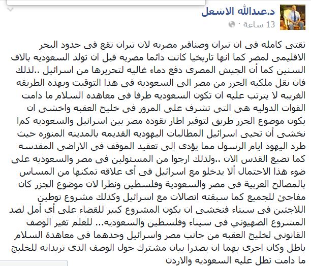 ورجا “الأشعل” المسؤولين في مصر والسعودية، عدم الدخول مع إسرائيل فى أي علاقة تمكنها من المساس بالمصالح العربية في مصر والسعودية وفلسطين، مضيفًا “ونظرًا لأن موضوع الجزر كان مفاجئًا للجميع كما سبقته اتصالات مع إسرائيل وكذلك مشروع توطين اللاجئين في سيناء، فنخشى أن يكون المشروع كبيرًا للقضاء على أي أمل لصد المشروع الصهيوني في سيناء وفلسطين والسعودية”.
