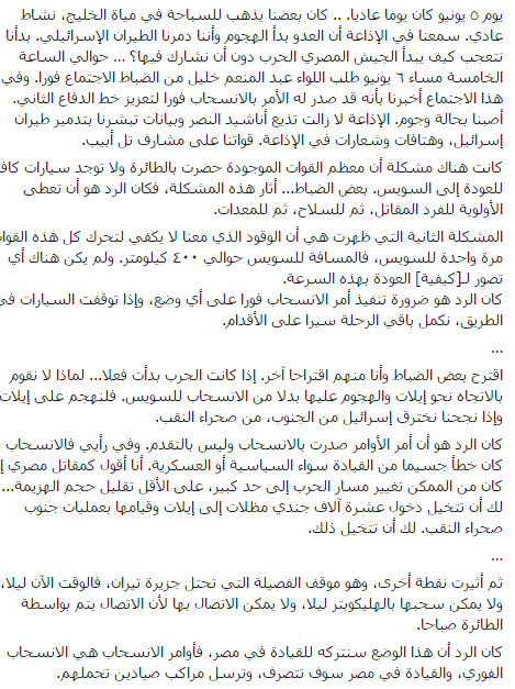 تابع “ولنقفز ليونيو سنة ١٩٦٧، ودعونا نقرأ الكلمات المؤلمة التي رواها أحد الضباط المصريين الذين شاركوا في الدفاع عن شرم الشيخ، والذي وصف ملابسات أسر الفصيلة المصرية التي كانت تحمي جزيرة تيران.. الضابط اسمه محمد عبد الحافظ، أحد رجال المظلات في شرم الشيخ، والذي أدلى بشهادته في كتاب (ضباط يوليو يتكلمون: كيف شاهد جنود مصر هزيمة ٦٧؟، تحرير عصام دراز، المنار الجديد، ١٩٨٩، صـ١٣٩-١٤١)”.