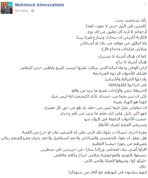 أعرب محمود المسلمي كبير المذيعين في البي بي سي عن رفضه اتفاق ترسيم الحدود بين مصر والسعودية والذي تضمن أن جزيرتي تيران وصنافير تتبعان السعودية، قائلا “أرض الوطن ودماء أبنائنا التي سالت عليها ليستا للبيع“.