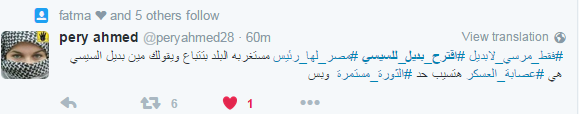بينما ردت فاطمة على اقتراحات البعض بأن يكون الدكتور محمد مرسي هو البديل قائلة: “الرئيس مرسي مش بديل للسيسي لأنه كان وما زال رئيس مصر ولا نعترف بغيره رئيسا إلا بانتخابات حرة”.