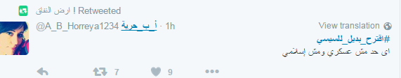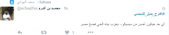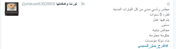 في ما اقترح حساب باسم شيكو البدائل وهي: “مجلس رئاسي مدني من كل التيارات المدنية لفترة 5 سنوات يتم فيها عمل دستور ومجالس نيابية وتشكيل حكومة محترمة وبناء دولة مؤسسات”.