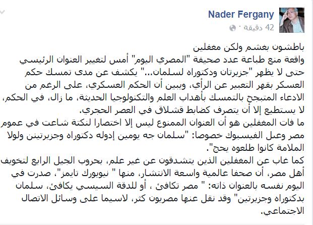 وأضاف “فرجاني” -عبر منشور له على “فيس بوك”- أن تغيير مانشيت “المصري اليوم” يبين أن “الحكم العسكري -على الرغم من الادعاء المتبجح بالتمسك بأهداب العلم والتكنولوجيا الحديثة- ما زال، في الحكم، لا يستطيع إلا أن يتصرف كضابط قشلاق في العصر الحجري”.