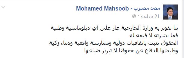 وصف محمد محسوب، أستاذ القانون ووزير الدولة للشؤون القانونية والنيابية سابقًا، ما تقوم به وزارة الخارجية من نشر الوثائق التي تثبت أحقية السعودية في جزيرتي تيران وصنافير بأنه “عار على أي دبلوماسية وطنية”.