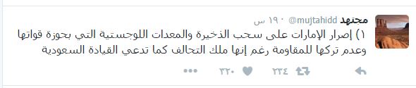 وأضاف “مجتهد”، “1- إصرار الإمارات على سحب الذخيرة والمعدات اللوجستية التي بحوزة قواتها وعدم تركها للمليشيات المتحالفة معها رغم أنها ملك التحالف كما تدعي القيادة السعودية”.