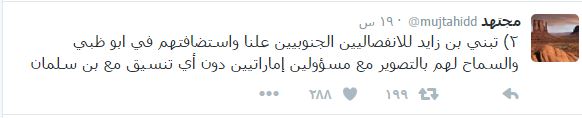 وقال “مجتهد” -في عدة تغريدات على “تويتر”-: “رحلة بن سلمان لـ أبوظبي هدفها امتصاص مشكلة كبيرة بين البلدين وذلك بتفاهم مباشر مع بن زايد على نقطتين تكاد تدمر الخطة السعودية في اليمن”.