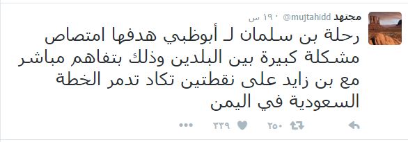 كشف صاحب حساب “مجتهد” السعودي المعارض الشهير على موقع التدوين المصغر “تويتر”، أن زيارة وزير الدفاع السعودي، محمد بن سلمان، إلى أبوظبي تأتي بهدف امتصاص مشكلة كبيرة بين البلدين.