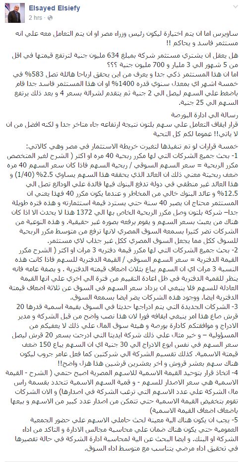 وضرب “الصيفي” مثالاً للفساد بالاقتصاد بمصر، برجل الأعمال نجيب ساويرس والذي قام بشراء شركة بمبلغ 634 مليون جنيه لترتفع قيمتها في أقل من 5 شهور إلى 3 مليارات و700 مليون جنيه، متسائلا: “كيف يتحقق ذلك، إما أن هذا المستثمر ذكي جدا ويعرف من أين يحقق أرباحا هائلة تصل 583% في خمسة أشهر أي بمعدل سنوي قدره 1400%، أو أن هذا المستثمر فاسد جدا قام بالضغط على السهم ليصل إلى 2 جنيه ثم يتقدم لشرائه بسعر 4 جنيهات وبعد ذلك يرتفع السهم إلى 25 جنيها.