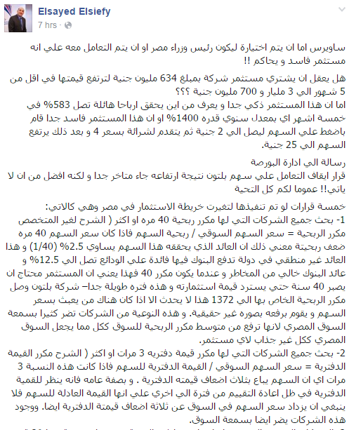 وقال السيد الصيفي في منشور له على صفحته الشخصية بموقع التواصل الاجتماعي “فيس بوك”، إن “هل يعقل أن يشتري مستثمر شركة بمبلغ 634 مليون جنيه لترتفع قيمتها في أقل من 5 شهور إلى 3 مليارات و700 مليون جنيه؟”.