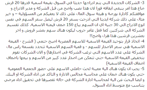 4- اتخاذ قرار بتوحيد القيمة الاسمية للأسهم المصرية أصبح حتميا (الشرح – القيمة الاسمية هي سعر الإصدار للسهم – وقمية السهم الاسمية تتحدد بقسمة رأس مال الشركة على عدد الأسهم التي ترغب الشركة في إصدارها)، والآن الشركات تقوم بتخفيض القيمة الاسمية حتى تتمكن من إصدار عدد كبير من الأسهم وبيعها بأضعاف أضعاف القيمة الاسمية).