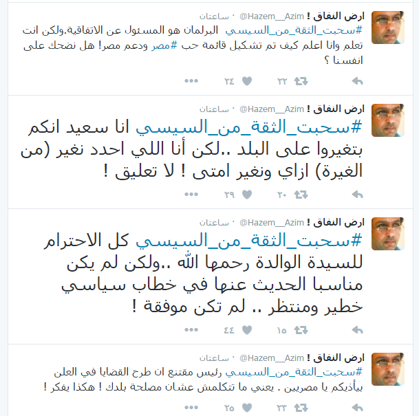 وكان حازم عبد العظيم نشر تدوينة أخرى على صفحته قبل خطاب السيسي بيوم، قال فيها: “بناء على رد الرئيس غدا سأحدد موقفي ليس من مصرية الجزيرتين من عدمه، لكن موقفي من سحب الثقة منه كرئيس لمصر”.