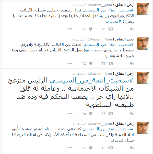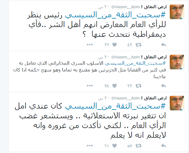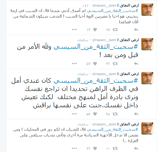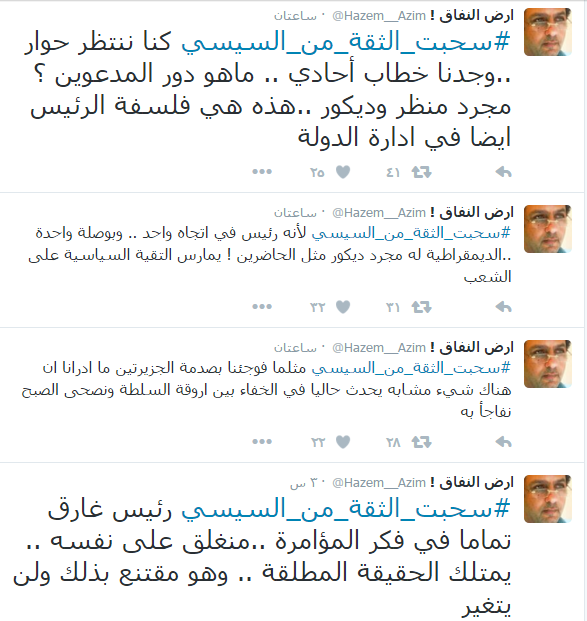 وكشف عبد العظيم، في عدة تدوينات نشرها أمس الأربعاء، على صفحته الشخصية بموقع التواصل الاجتماعي “تويتر” أسباب سحب الثقة من السيسي، التي أعلنها بعد خطابه الذي ألقاه خلال لقائه بعدد ممن وصفهم الإعلام بممثلي المجتمع المصري، حيث اعتبره: “رئيسا في اتجاه واحد، وبوصلة واحدة”.