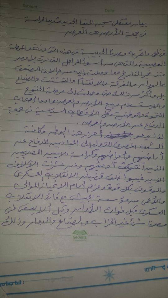 دعوا في رسالة – وصلت “رصد” نسخة منها – المصريين للأحرار للنزول للدفاع ” عن الذين انتهكت كرامتهم وآدميتهم في سجون الانقلاب العسكري”، بحسب نص الرسالة.