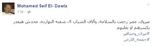 وكتب محمد سيف الدولة، الباحث في الشؤون القومية والعربية: “مبروك، مصر رجعت بالسلامة، وآلاف الشباب ال شفته النهارده، محدش هيقدر يكسرهم أو يغلبهم”.