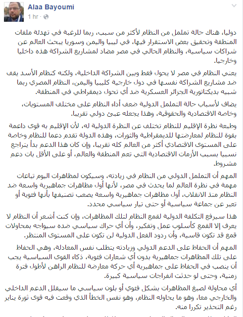 وشدد علاء بيومي أن الحفاظ على الدعم الدولي وزيادته يتطلب نفس المعادلة، وهي الحفاظ على تلك المظاهرات جماهيرية بدون أي شعارات فئوية، وذكاء القوى السياسية يجب أن ينصب في الحفاظ على جماهيرية أي حركة معارضة للنظام الراهن لأطول فترة زمنية، وحتى لو حدثت انفراجات سياسية كبيرة.