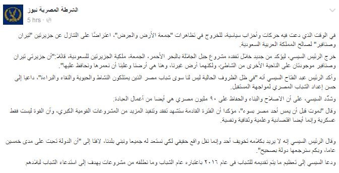 قبل عدة أيام، دعا نشطاء عبر مواقع التواصل الاجتماعي، إلى النزول لميادين مصر المختلفة، احتجاجًا على تنازل عبدالفتاح السيسي عن جزيرتي تيران وصنافير إلى المملكة العربية السعودية، وحددوا اليوم 15 أبريل 2016، يومًا للتظاهر العام.